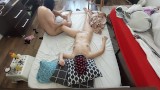 Heißes Vorspiel mit einem Paar, Ölmassage des Körpers. Lecken der Muschi der Frau bis zum Orgasmus.