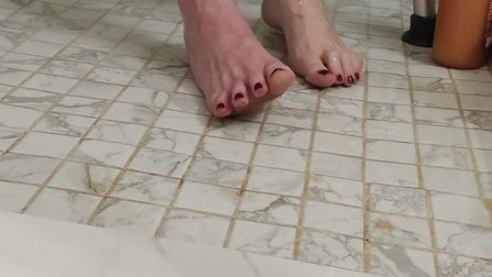 Cleaning my dirty soles in the shower with a pumice rock and showing how clean I got them
