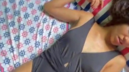 minha namorada magrinha com aparelho nos cabelos cacheado de maiô