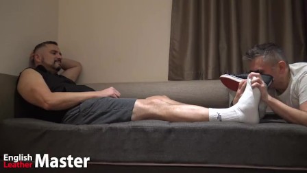 Slave worships Master's sweaty trainers, white sports socks and huge feet PREVIEW